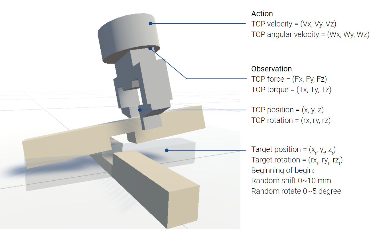 Customized reinforcement learning environment in simulation allows the neural network to explore and improve its skills